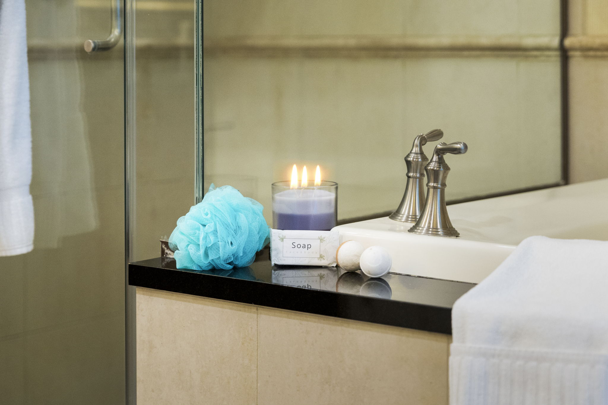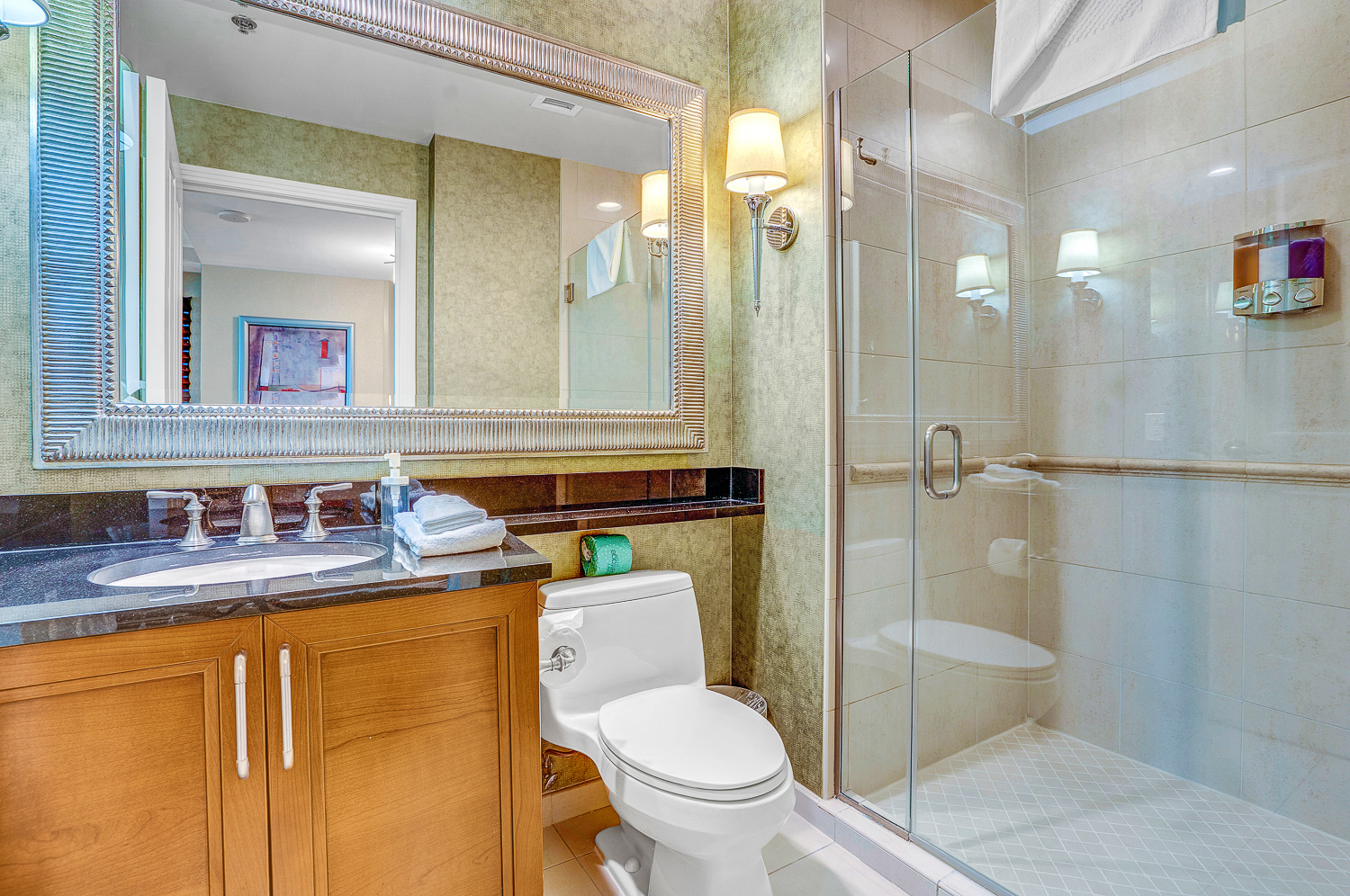 The studio features one modern bathroom, complete with a walk-in shower, a deep soaking tub, and a toilet. Designed for comfort and relaxation, it’s the perfect space to unwind after a day exploring the Las Vegas Strip. Whether you're getting ready for a night out or enjoying a quiet soak, this bathroom has everything you need for a refreshing experience.