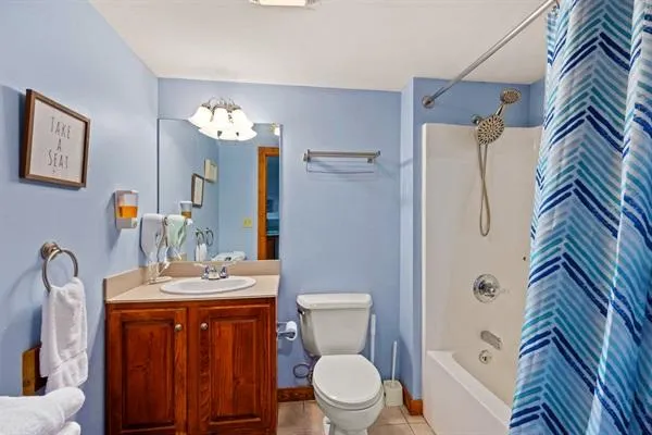 The condo includes a well-appointed full bathroom, offering everything you need to freshen up after a day on the slopes. Your stay includes a housekeeping package with essentials like towels, a kitchen towel, toilet paper, trash bags, and bar soap.